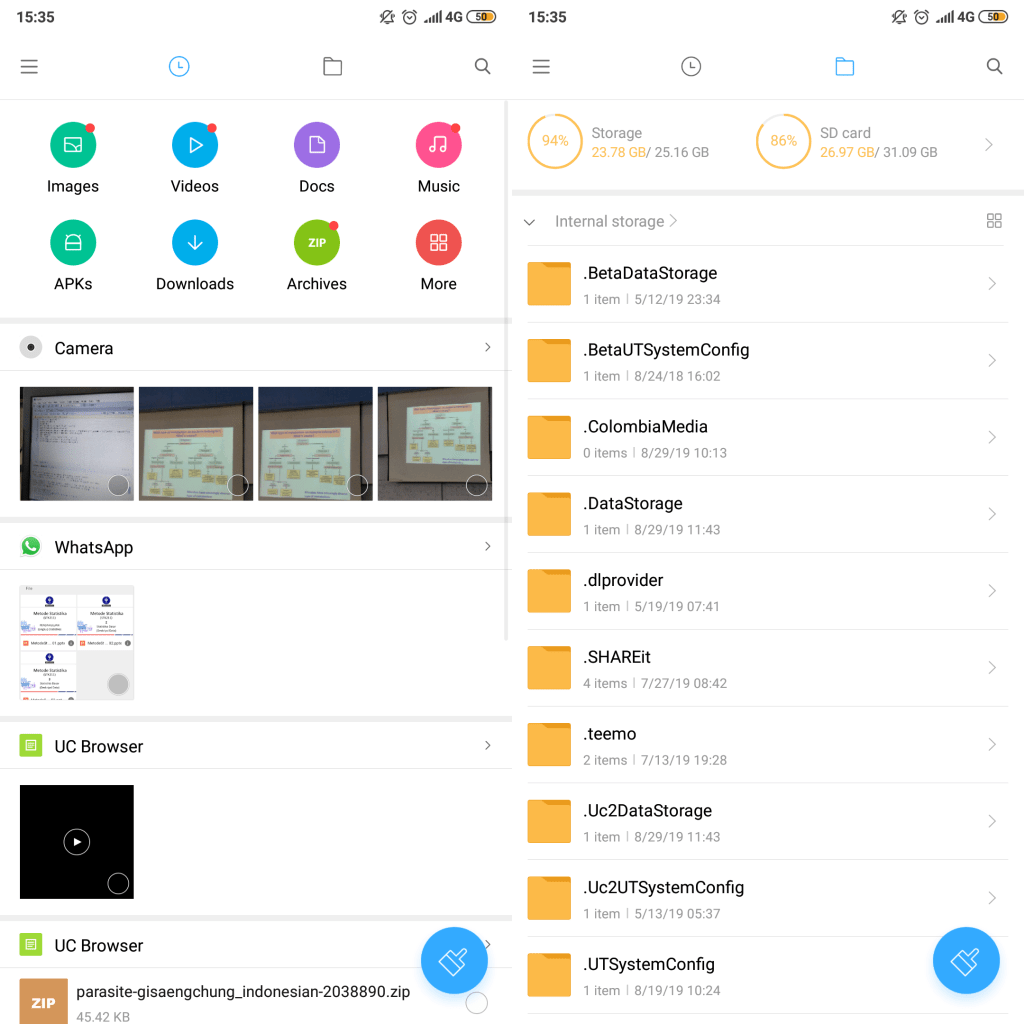 File manager merupakan fitur bawaan smartphone yang dapat membantu kita dalam memanajemen file yang kita miliki seperti memindahkan, menyusun, merename, dan memantau file-file yang kita miliki. Dalam aplikasi ini kita juga dapat melihat kapasitas dan ketersediaan ruang penyimpanan yang kita miliki. Namun penggunaan penyimpanan tidak diperlihatkan secara detil dalam aplikasi ini,untuk melihat detil penyimpanan kita dapat menuju settings > storage.Detil penyimpanan akan terlihat seperti ini.