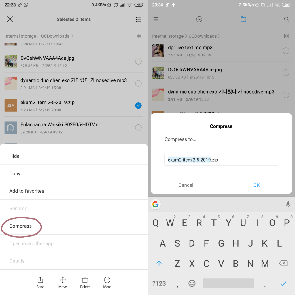 Compress file adalah salah satu fitur untuk memperkecil ukuran file. pada hp xiaomi fitur compress file ini sudah tersedia dalam file manager. Untuk menggunakan fitur ini sobat tingal pilih file mana yang akan di compress kemudian klik more (ikon titik 3) pada kiri bawah layar dan pilih compress.